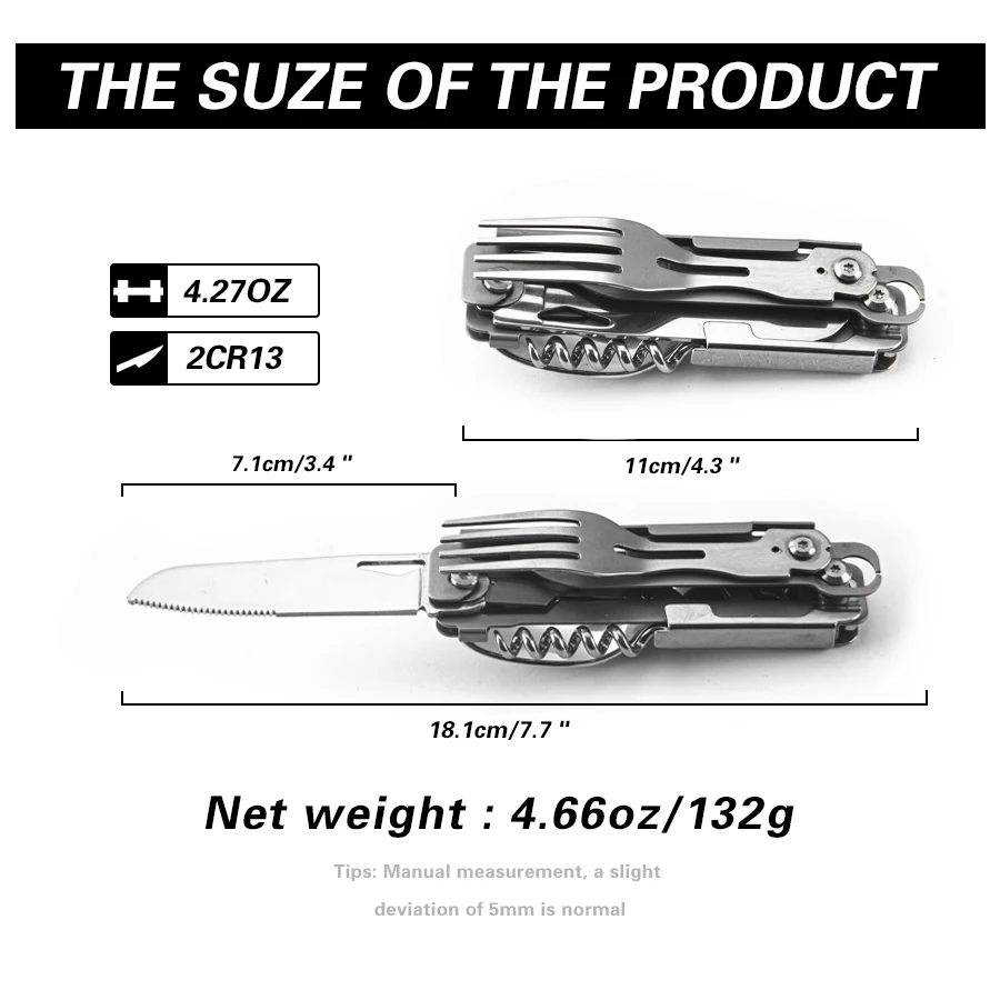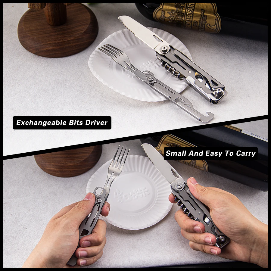 Multifunctional Design: Includes a knife, fork, spoon, and red wine bottle opener, catering to various outdoor dining and entertainment needs.